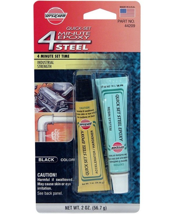 Epoxy steel adhesive 4 minutes Versachem 4 Minute Steel Epoxy 56.7 g is a fast acting industrial epoxy resin that is excellent for bonding metal to metal or repairing defects in metal, wood and masonry. After complete hardening of the steel-like mass, it can be subjected to shock loads, grinding, painting.
