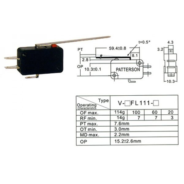 Patterson Micro lever switch long lever plate 61mm 12A 250V AC
