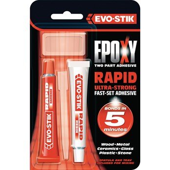 Evo-Stik Rapid Epoxy Adhesive is super strong and long lasting. It has been formulated to bond with virtually any material. It can be used with metal, wood, masonry, ceramics, glass, leather; fabrics and most plastics.