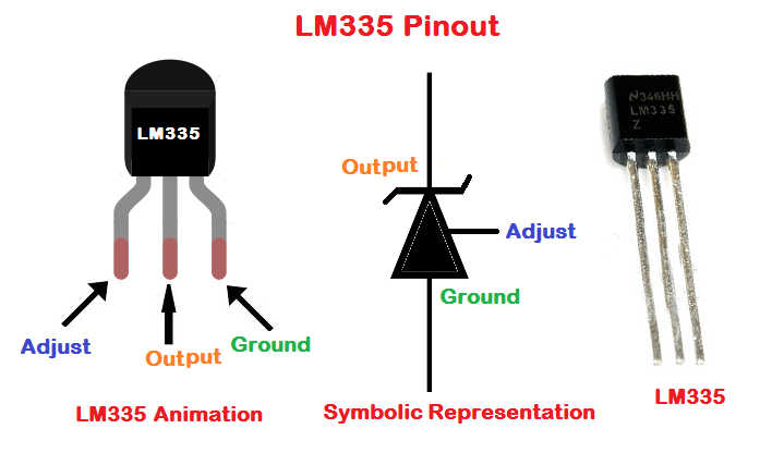 LM335 is a low cost temperature sensor and gives highly precised results. It operates as a two terminal zener diode. It has low dynamic impedance less than 1 ohms. It has a large range for temperature i.e. -40 degree Celsius to 100 degree Celsius. At 10mV/K its breakdown voltage becomes directly proportional to its absolute temperature. large temperature ranges, initial accuracy up to 1 degree Celsius and low dynamic impedance are its major and unique features. It can be used in HVAC, home appliances, power supplies etc. LM-335 is shown in the figure given below