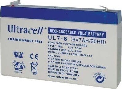 The Ultracell UL7-6 6V lead battery has a large capacity of up to 7,000 mAh (at 0.350A). The VRLA (valve-regulated lead-acid) lead battery is largely maintenance-free and delivers very reliable performance. Lead batteries are suitable for use in small vehicles, servers and other large mobile devices.