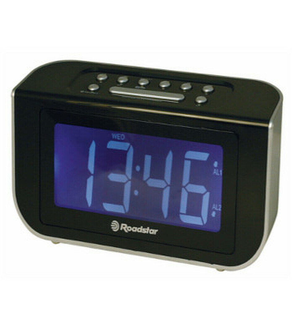 Roadstar CLR-2615 Clock Radio/Radio Alarm Clock in Slim Design with Large LED Display, Two Alarm Times and Sleep Timer, 20 Station Memories, Radio Tuner, Black.